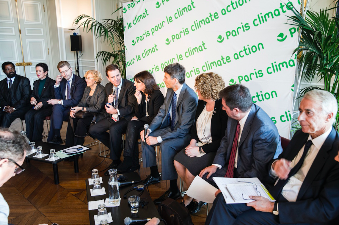 Press Conference at Paris City Hall with C40 Mayors. Left to right: Accra Mayor Alfred Vanderpuije, Sydney Lord Mayor Clover Moore, Copenhagen Lord Mayor Frank Jensen, Madrid Mayor Manuela Carmena, C40 Chair & Rio Mayor Eduardo Paes, Paris Mayor Anne Hidalgo, Vancouver Mayor Gregor Robertson, Stockholm Mayor Karin Wanngård, Athens Mayor Giorgos Kaminis, and Milan Mayor Giuliano Pisapia.