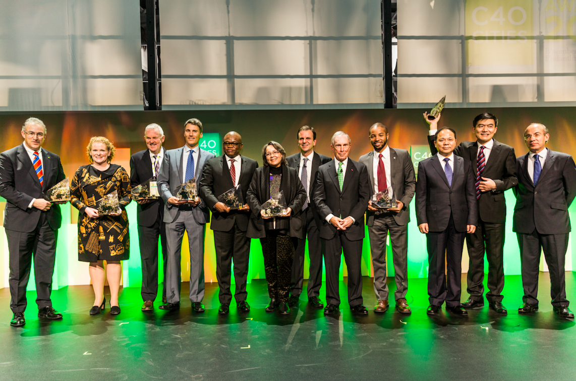 C40 Awards Winners join C40 Chair Eduardo Paes and U.N Secretary-General's Special Envoy for Cities and Climate Change Michael R. Bloomberg on stage