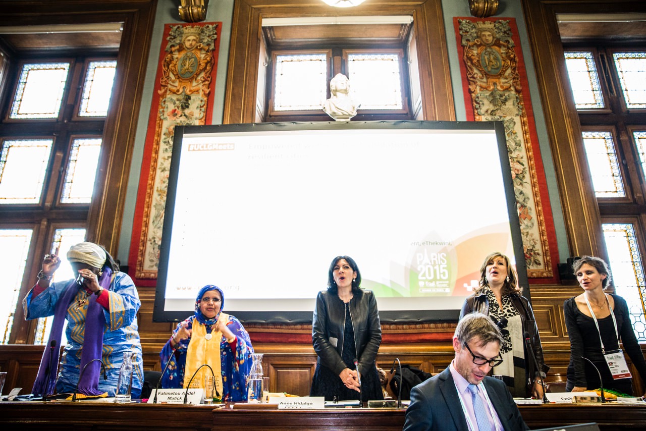 Female leaders at C40 and UCLG's Women and Development event – Empowered Women – the foundations for resilient cities. Left to right: Bangangté Mayor Celestine Ketcha Courtès, Tevragh-‐Zeina Mayor Fatimetou Mint Abdel Malickis, Paris Mayor Anne Hidalgo, UCLG Deputy Secretary General Emilia Saiz and Santiago de Chile Mayor Carolina Tohá
